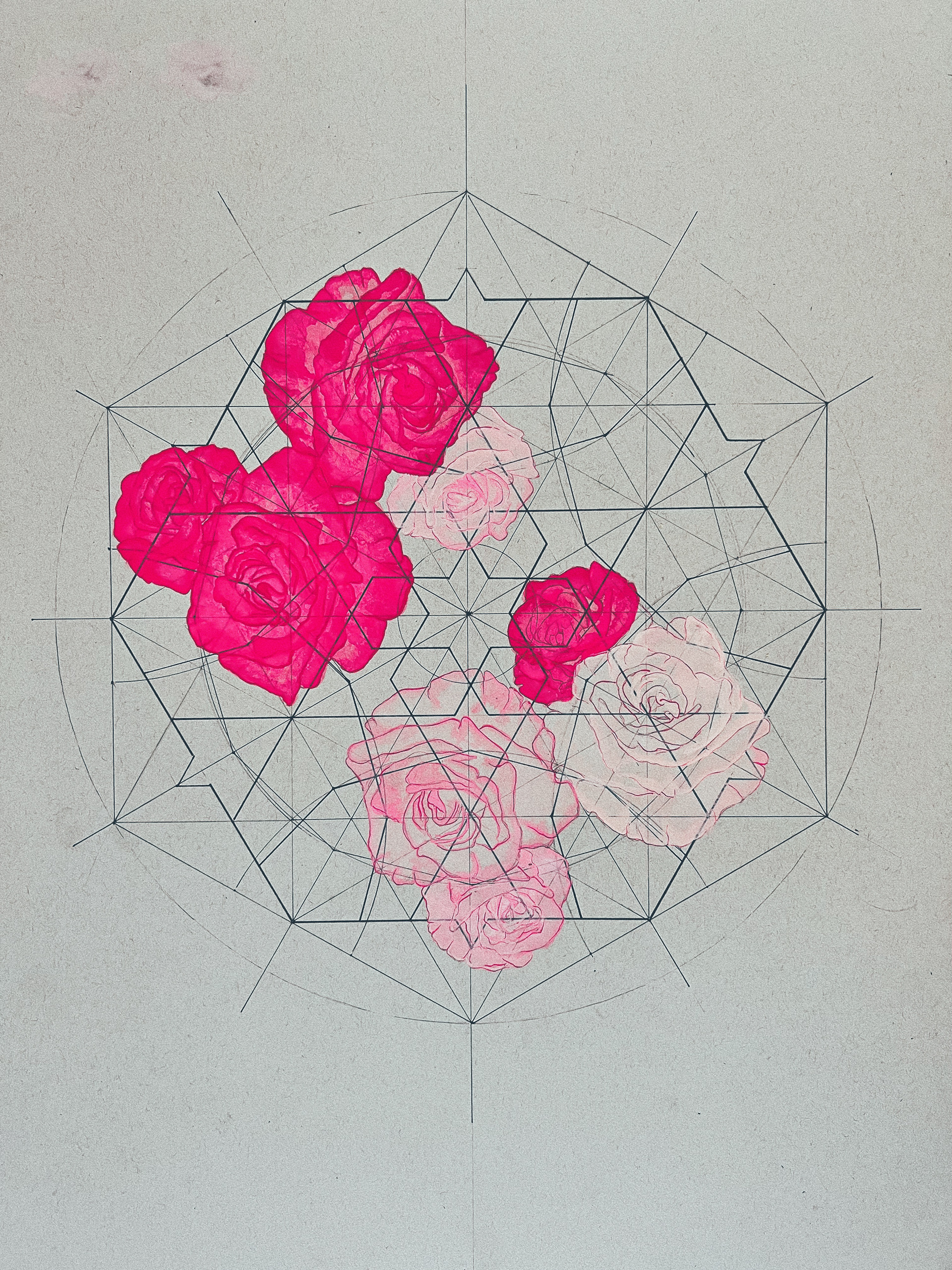 Created in 2023, Roses on Islamic Geometry is a unique piece that combines delicate pink roses, painted in gouache, with the precise construction lines of Islamic art. This artwork is a personal reflection of my attachment to the foundation of my culture as an Arab Muslim living in the U.S. It speaks to the struggle of identity I experienced while being away from everything familiar, trying to establish myself as both a mother and an artist in a foreign land.