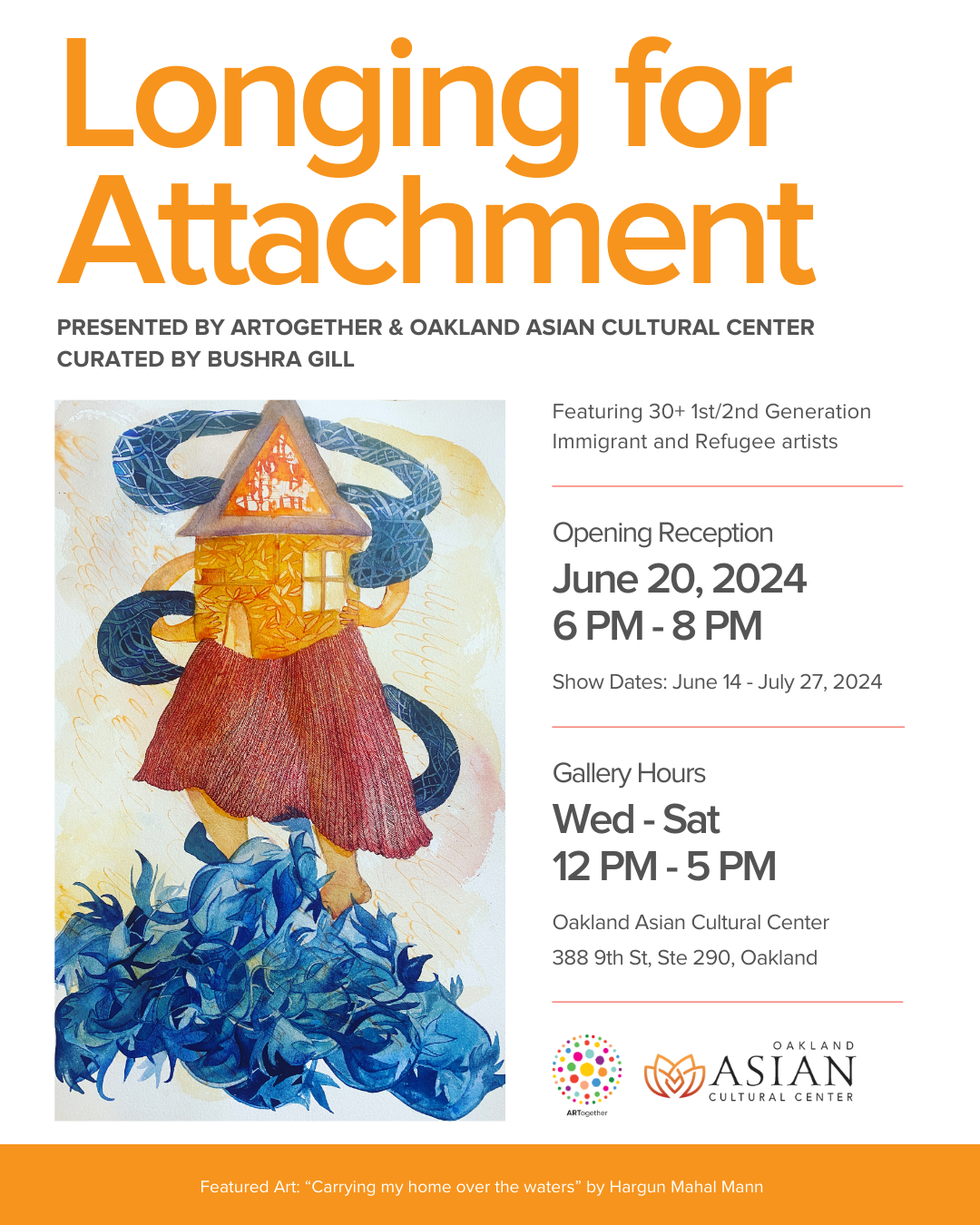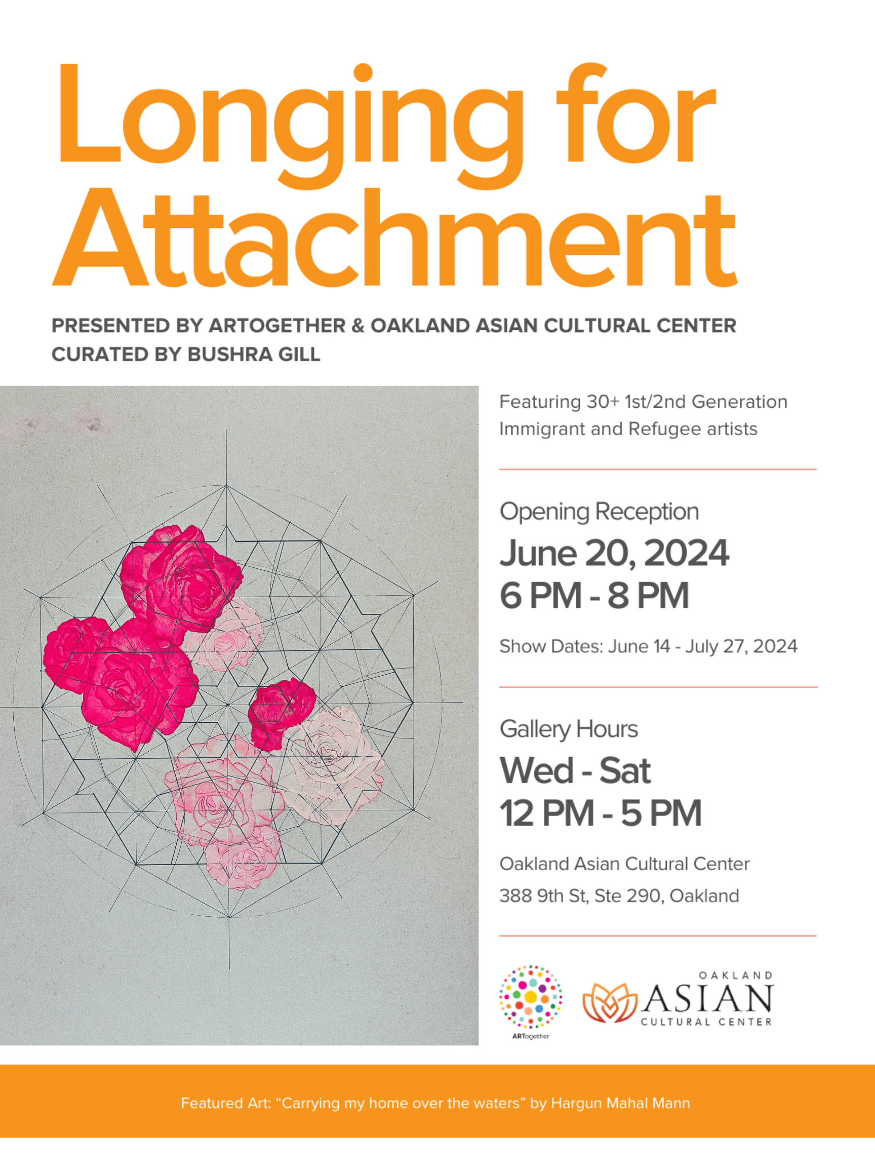 Curated by Bushra Gill & presented by ArTogether, The Oakland Asian Cultural Center is proud to host "Longing for Attachment," a captivating exhibition running from June 14, 2024 to July 27, 2024. This exhibit brings together artists from diverse backgrounds to explore the profound theme of attachment, identity, and belonging. Through various artistic mediums, the exhibition delves into the intricate connections we forge with our heritage, culture, and personal experiences.